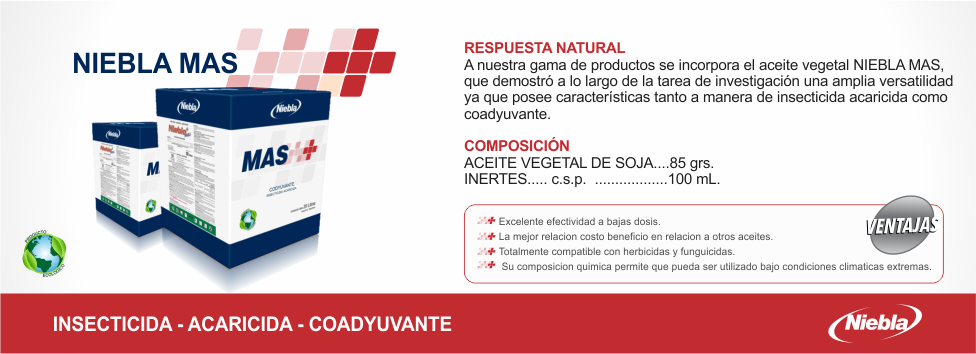 acaricida coadyuvante NIEBLA MAS, cuya base es el aceite de soja y que por sus características de origen vegetal en su